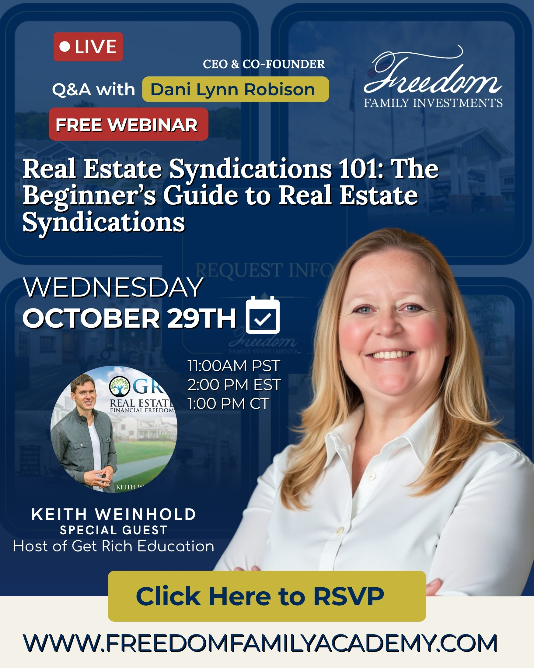 LIVE Q&A with Dani Lynn Robison - CEO & Co-Founder Real Estate Syndications 101: The Beginner’s Guide to Real Estate Syndications Wednesday, October 29th 🕚…